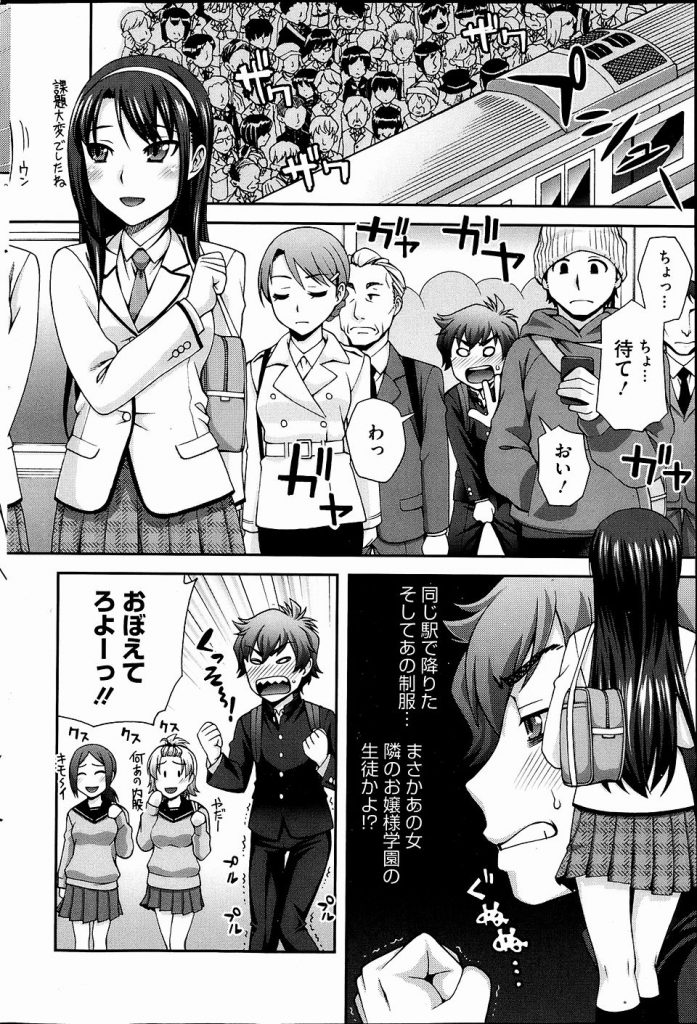 通学電車内で隣のお嬢様学校の女子高生に痴女行為されパンツの中で射精した男が屈辱を晴らすべく下校を待ち伏せし電車に乗り込むとまたもや痴女行為でチンポを触られ反撃にチンポをモロ出しすると自分のパンツをずらして生スマタで亀頭を擦られあえなく射精し駅のトイレに連れ込まれると拘束され逆レイプで犯される!