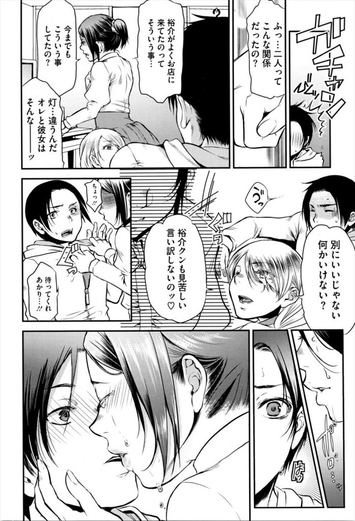 【エロ漫画】漫画喫茶店員のエロい人妻にカップル席で迫られセックスしているのを幼馴染に見られ3P突入!
