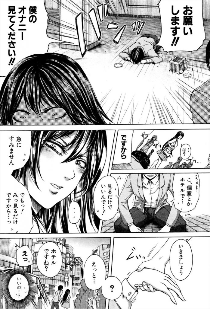 【えろまんが】ティッシュ配りのバイト中にSっ気満載の女性にマスターベーション見て欲しいとお願いしたらOKでした!