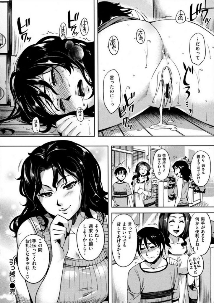離婚してバツイチになった叔母の引っ越しを手伝う甥っ子が幼い頃から好きだった叔母に告白して成長した自分をアピールするが相手にされず突き放されると力任せに無理やり襲い掛かりキスして強引にパンティーに手を突っ込み愛撫して感じさせ久しぶりの性行為に敏感になってる叔母のわがままボディをバックから生ハメ中だしする甥っ子!