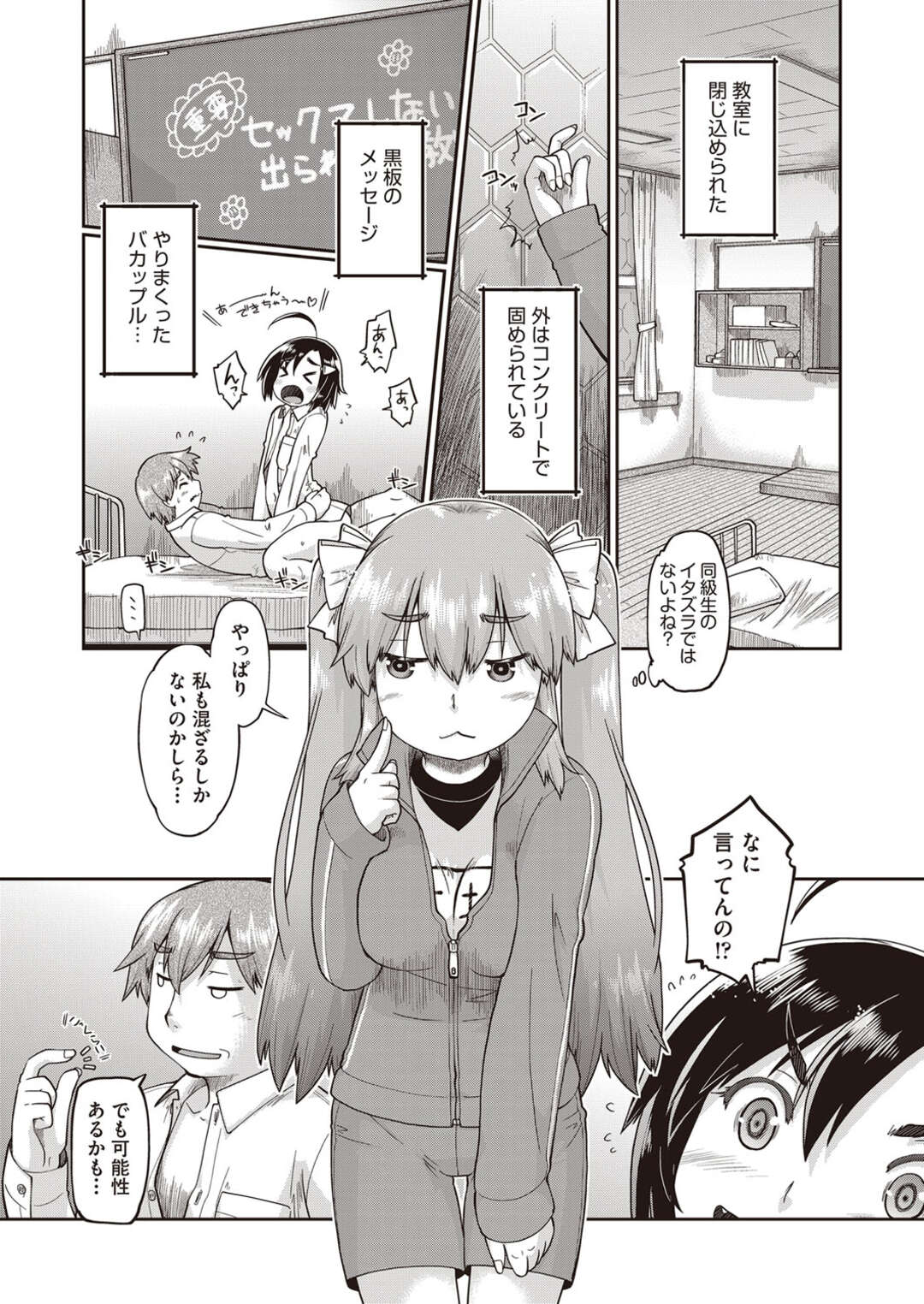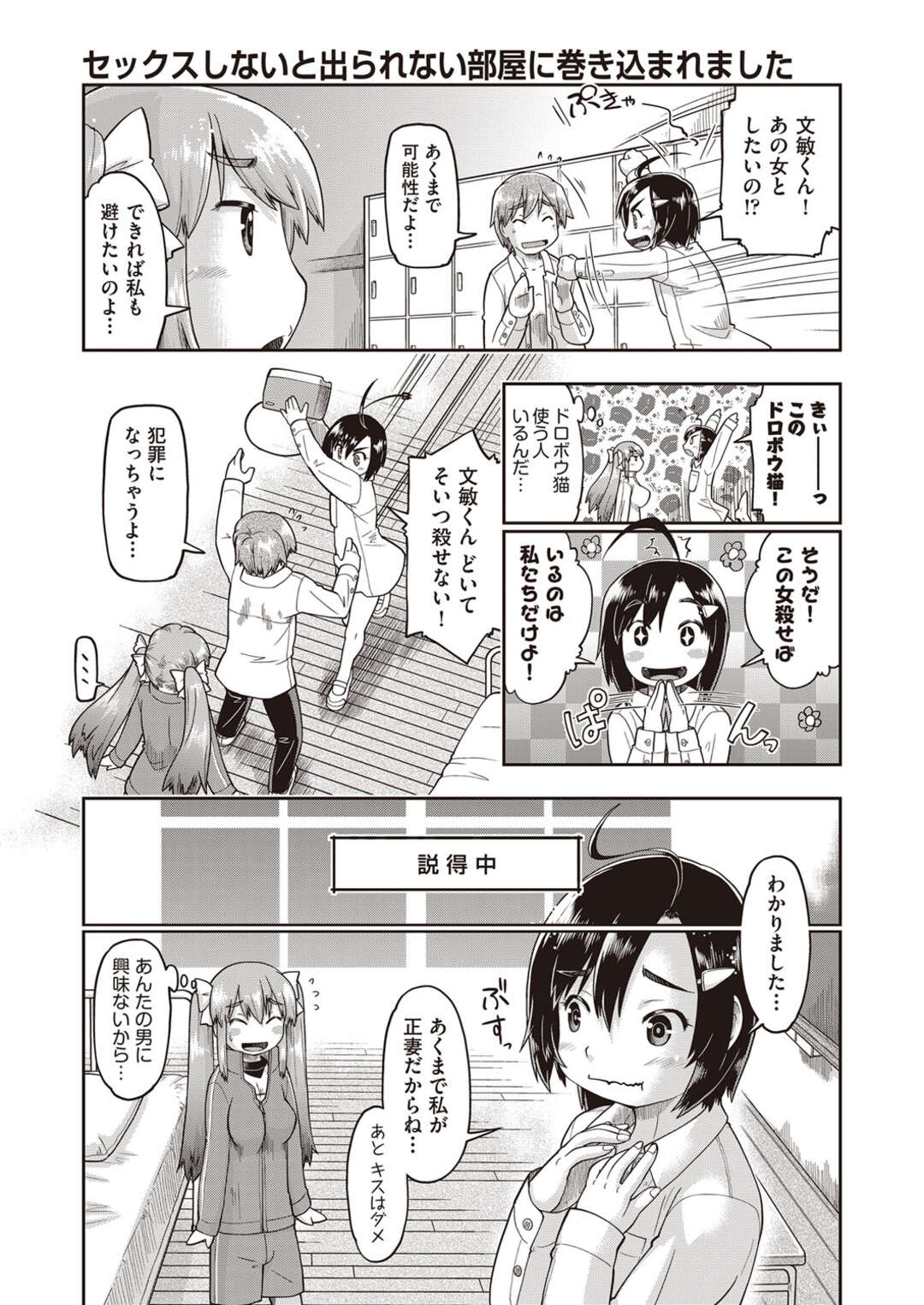 - >セックスしないと出られない部屋とは知らずに居眠りから目覚めるとバカップルがヤりまくって存在をアピールする根暗女子。みんなで脱出のためにセックスの相手を志願して彼女以上のテクを披露してから最終的には3Pセックスで仲良く同時イキフィニッシュ!