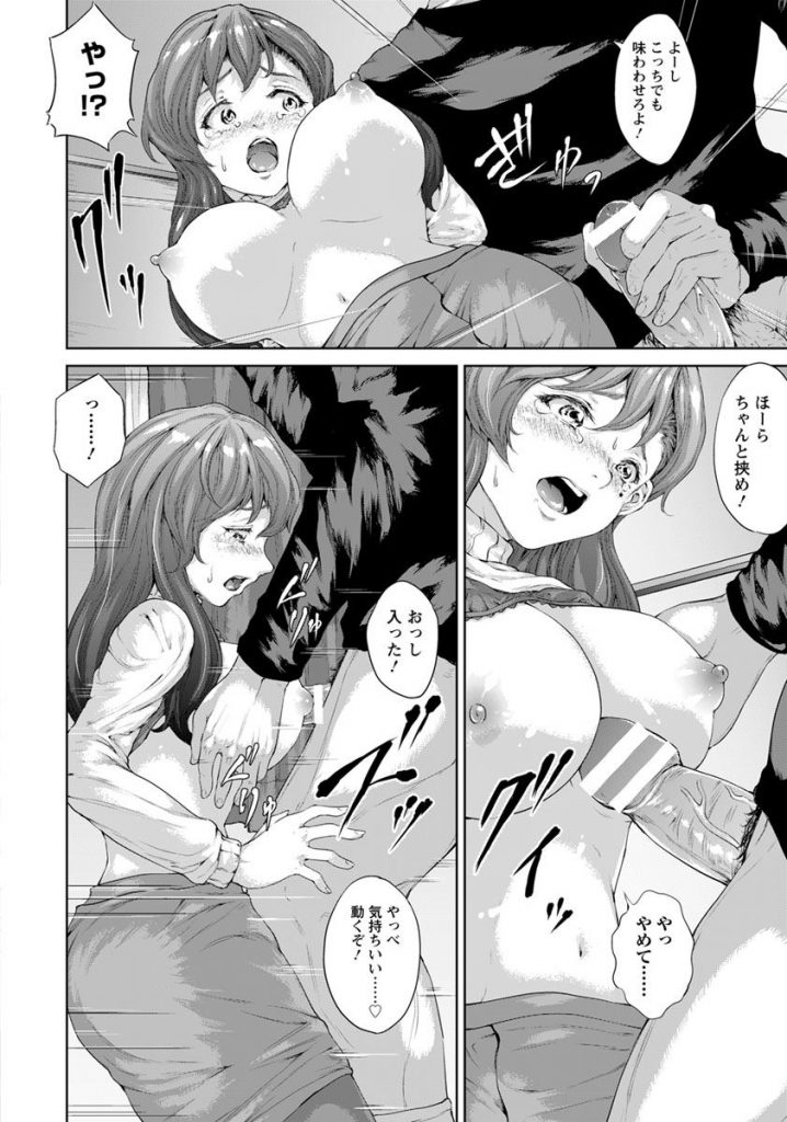 【エロ漫画】家賃が払えない未亡人に強制パイズリしてレイプする管理人を見た息子も参加して母子姦サンド二穴挿入!