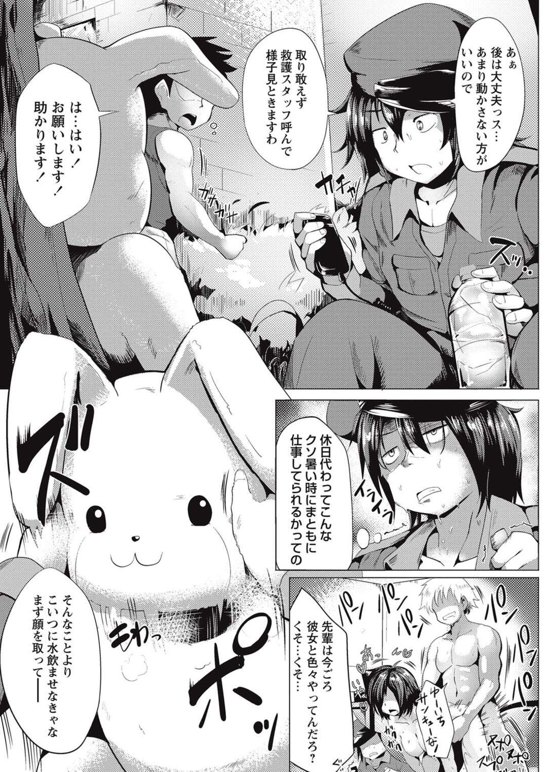 - >夏の暑さの中着ぐるみを着て軽い脱水症で倒れてしまった女性。服を脱がし汗だくの体に彼は興奮してしまい生ハメで中出しレイプに絶頂しちゃう
