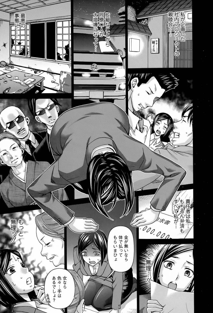 【えろまんが】社内親睦会で同僚二人が乱闘し壊した店の弁済にAV出演することになった美人OL!