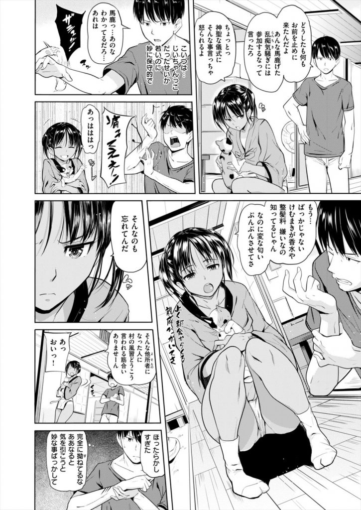 - >【エロ漫画】村のお祭りで男と一晩中交わる儀式に参加する妹の貞操を守ろうと参加した兄が勢いのまま近親交尾!
