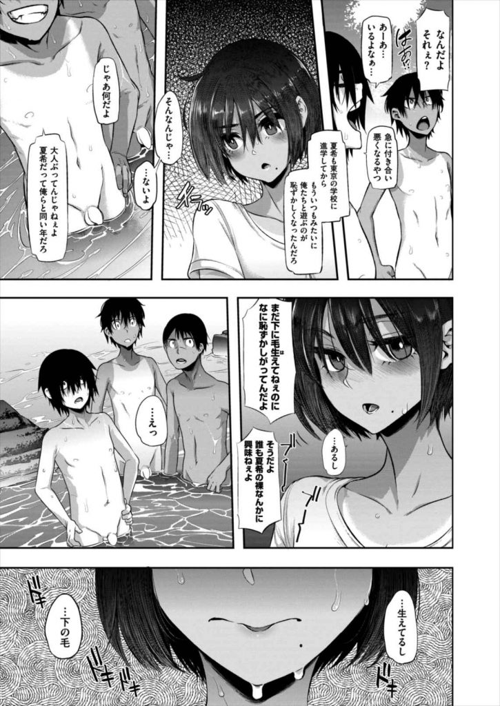 【エロ漫画】田舎で水遊びする少女が生えだした下の毛を見せると興奮した少年達に次々犯され中出しでイキ続ける!