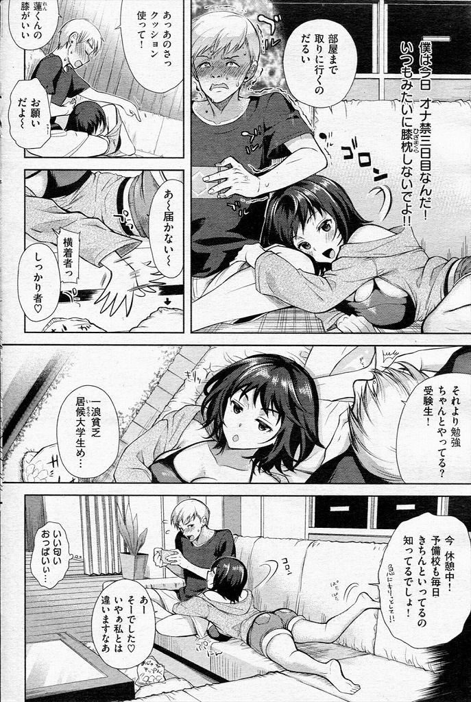 【エロ漫画】家ではノーブラが当たり前の無防備な従姉に予備校生の男がてこきで亀頭責めされ顔面暴発の初セックス!