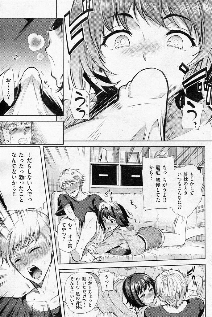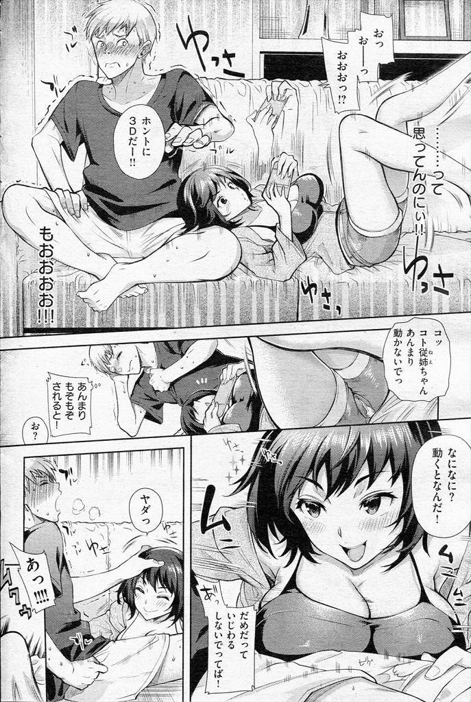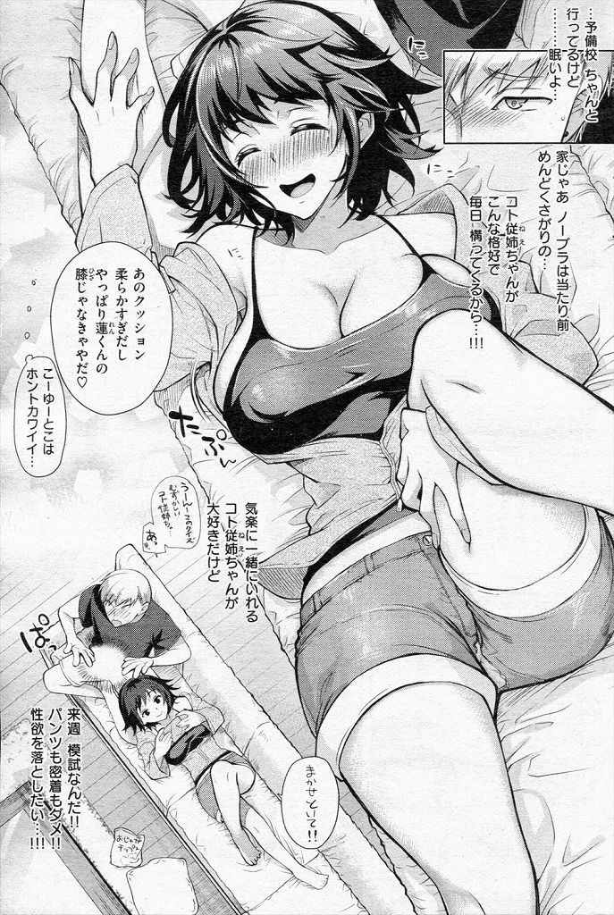 - >【エロ漫画】家ではノーブラが当たり前の無防備な従姉に予備校生の男がてこきで亀頭責めされ顔面暴発の初セックス!