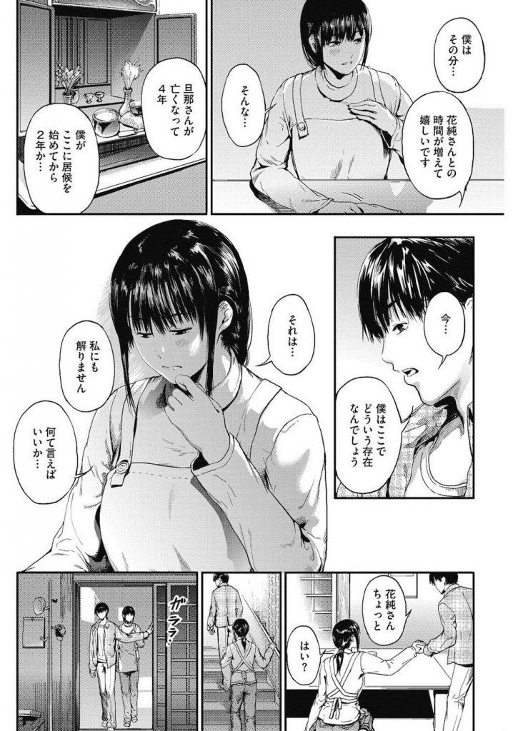 - >【エロ漫画】デカ乳未亡人に朝勃ちを口で性処理してもらう居候の男が乳内射精から顔面に精液を塗り窓際で立ちバック!