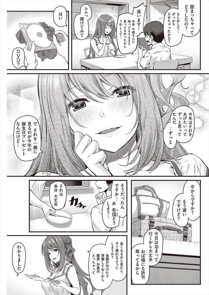 物心ついた頃からずっと一緒だった実の姉のような存在のお姉さんと誕生日プレゼントのDVDを一緒に見ていると自撮りで服を脱いでいき乳首を自分で舐め上げM字開脚でオマンコを拡げるとディルドオナニーで腰を振る卑猥な姿を見せられながらローション塗った手マンコにチンポを突っ込み口内射精すると筆おろしセックスで童貞卒業する少年!