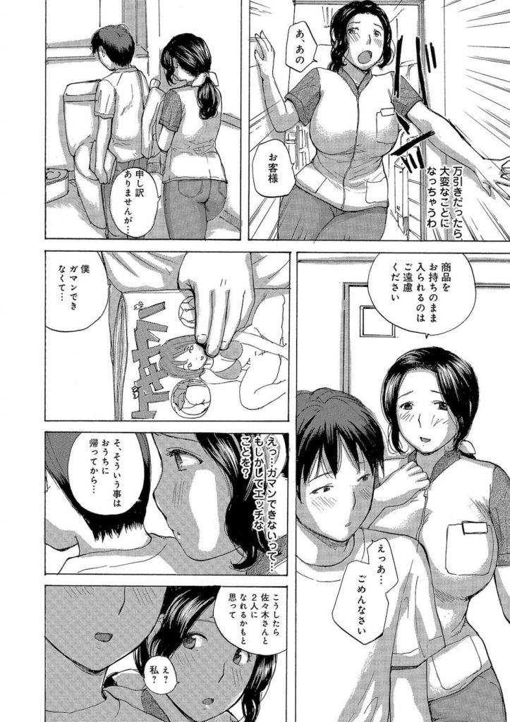 コンビニ店員の人妻熟女が商品を持ったままトイレに行く若者を追いかけて注意するとエロ雑誌を持ち込んでシコろうとしてたとチンポを出して迫られ告白されると手コキしてあげるとジーパンのピチピチお尻を褒められ擦りつけられるとパンツごとずり下げられスマタでマンコキ射精からバックハメでお礼のピストンでイカされて中だしアクメする!