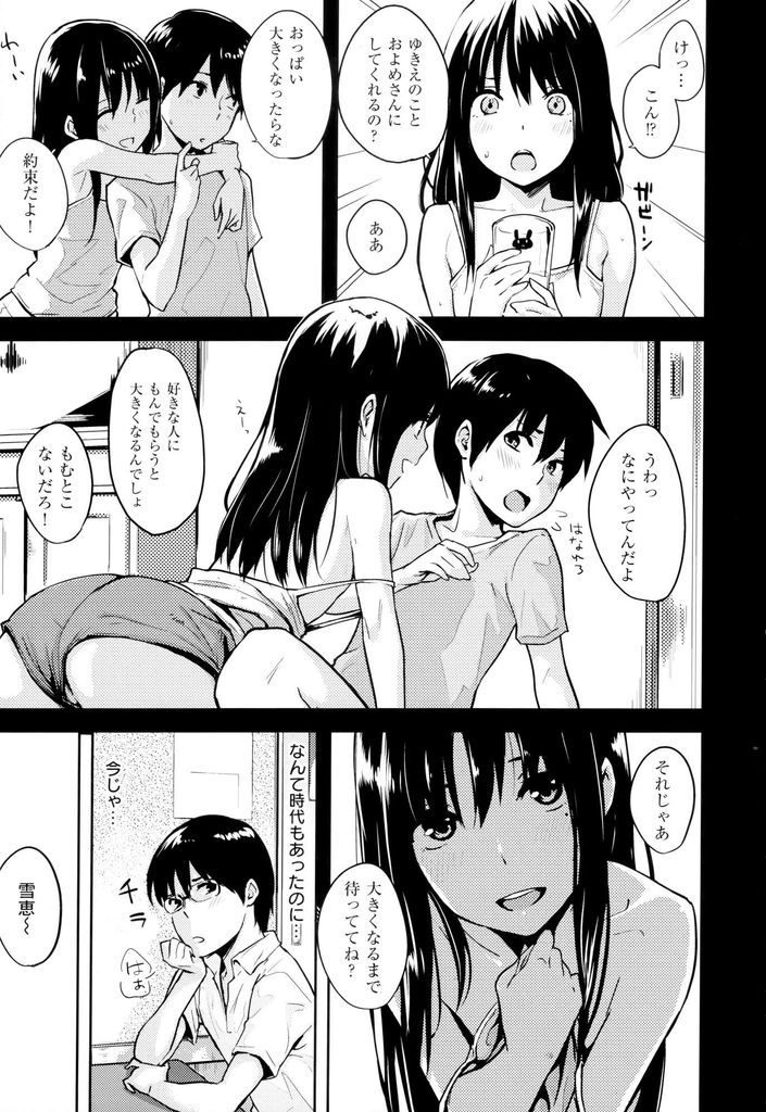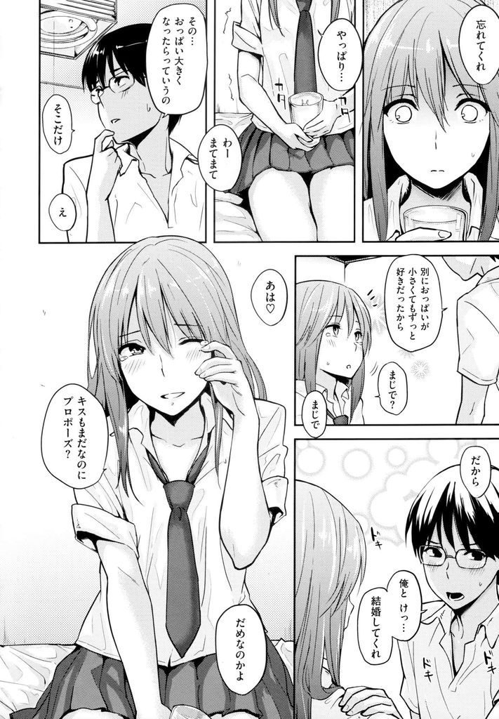 - >【エロ漫画】子供の頃におっぱいが大きくなったら結婚しようと約束した幼馴染JKの発育途中のペチャパイボディでH初体験!
