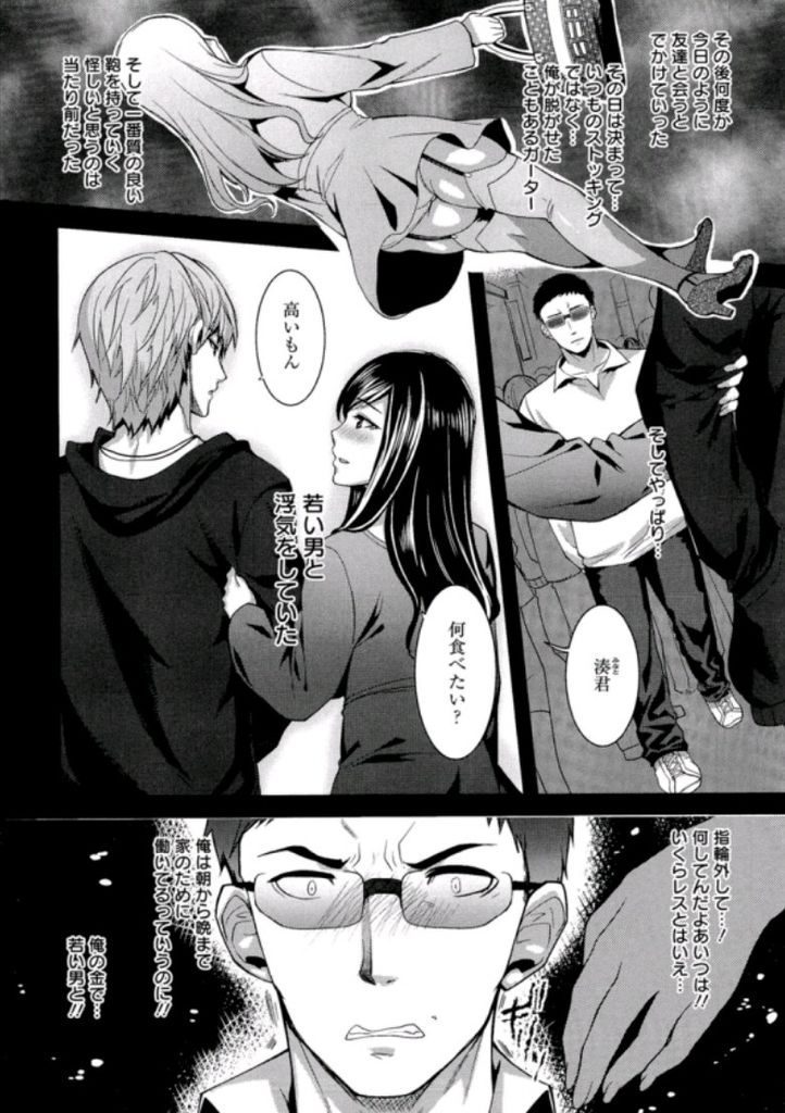 - >【エロ漫画】若い男と浮気する妻を尾行する旦那が公衆便所で肉便器になり見知らぬ男達の精液を浴びる淫乱な妻の姿にフルボッキ!
