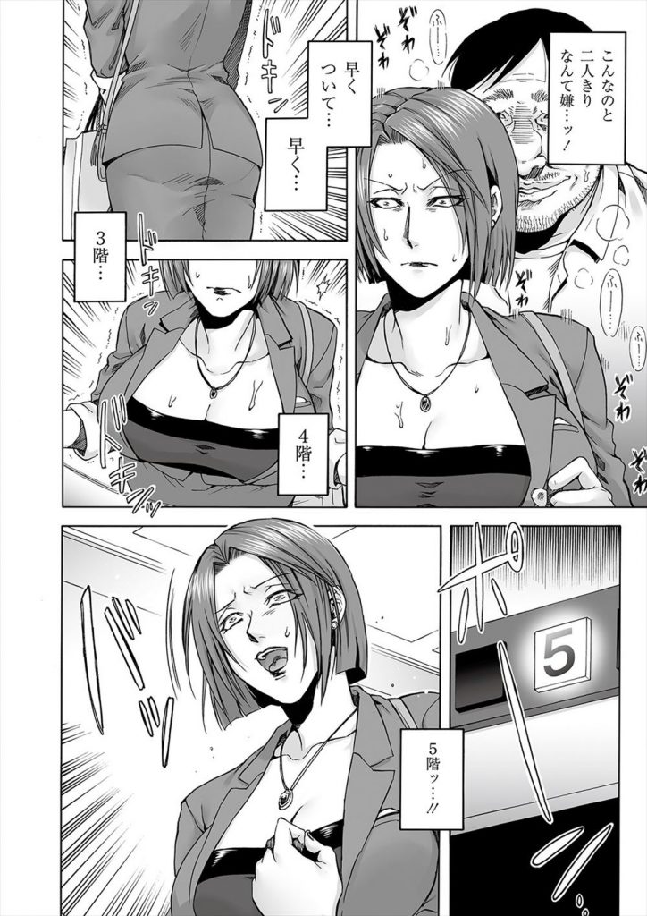 【エロ漫画】巨乳女が痴漢のキモ男とエレベーターに閉じ込められ窓からギャラリーに撮影されながら公開レイプで結合部を晒す!