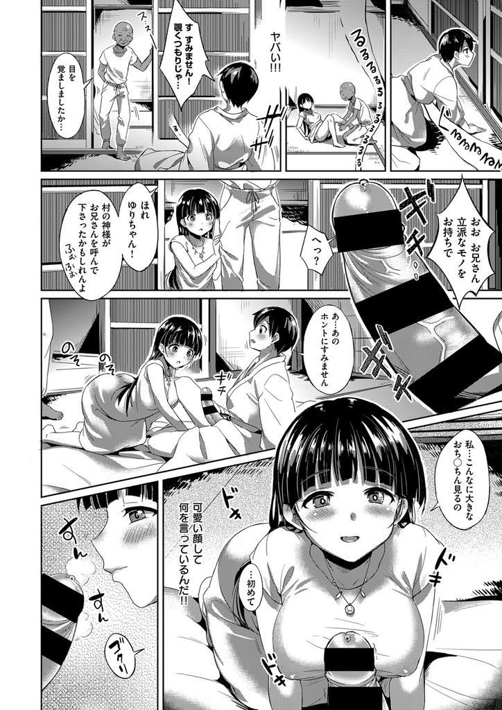 山で遭難してた男が黒髪ロングの美少女と偶然出会い意識を失い倒れる!目覚めるとマンコを爺に舐められてる性欲旺盛な女がいて男はボッキしてしまい神様の送り物だと思われる♡初めて見るデカマラを喉奥まで咥えて吐精さす♡食事を食べ部屋で二人になり手めこし乳首を転がし指でおそそを慣らしてバックで挿入から正常位で膣内を痙攣させ膣内射精する!