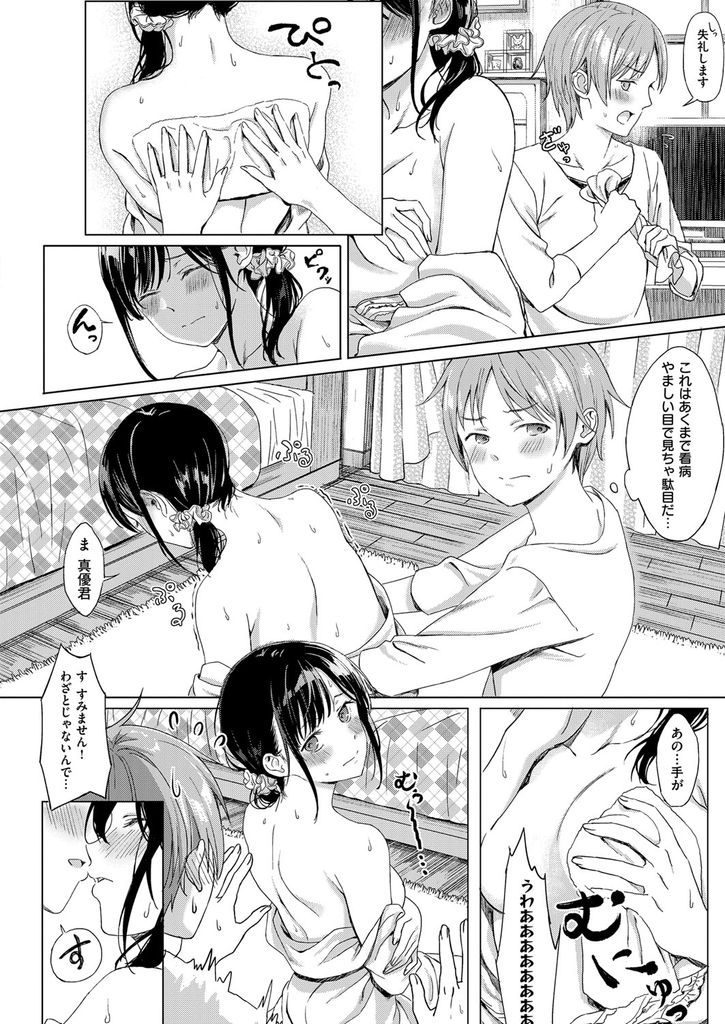 - >【エロ漫画】職場で倒れた清楚で美乳な先輩のお見舞いで身体を拭いて上げたら発情しイチャラブセックスに発展して絶頂する!